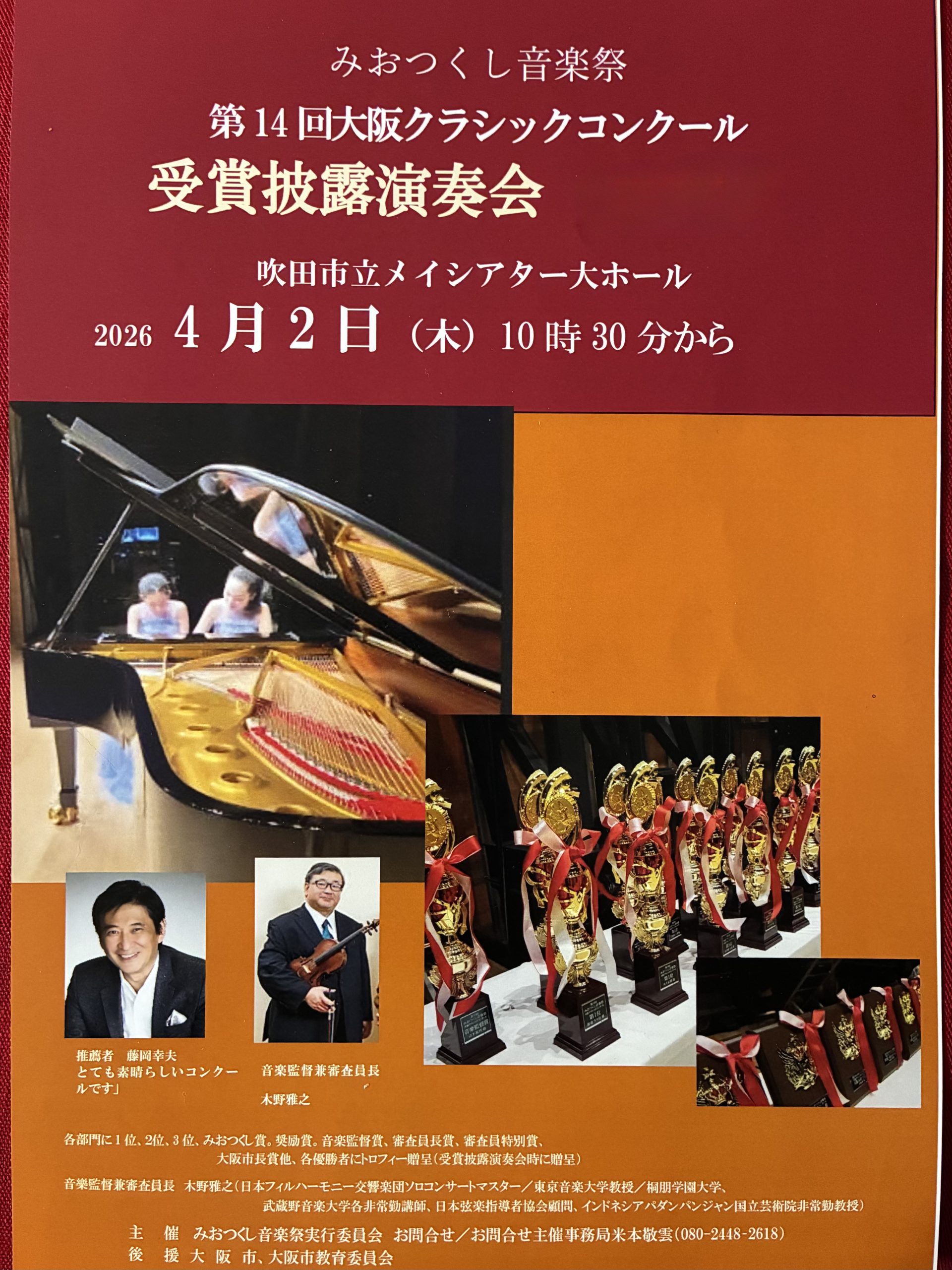 4月2日、吹田市メイシアター大ホールにて、今年1月に開催大阪クラシック音楽コンクール入賞者の披露演奏会があります。